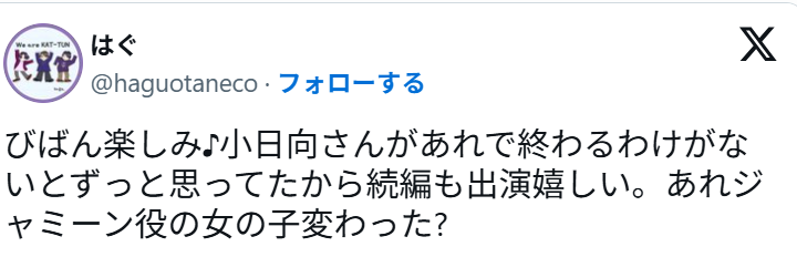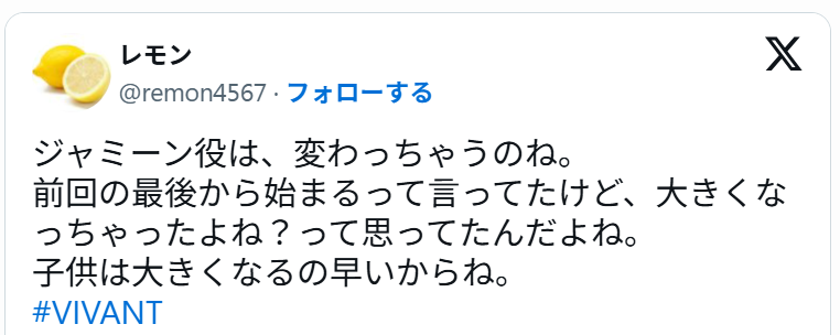 ネットでは、ジャミーン役の女の子変わった?というツイートが多くみられました。