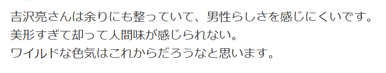 ネットにあがる「かっこよくない」は、完璧すぎて距離を感じる、役柄で印象が変わる、中世的な感じが好みをわけるといった好みの違いによるものが大半だと感じました。